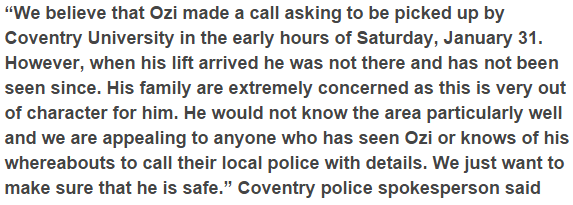 Based on police reports, Ozeivo, a new entrant at the Coventry University, UK was last seen at Iglu club on Spon street where he went to hold out along with his friends. Coventry police believe Ozi had called after leaving the club to be acquired from wherever he was.