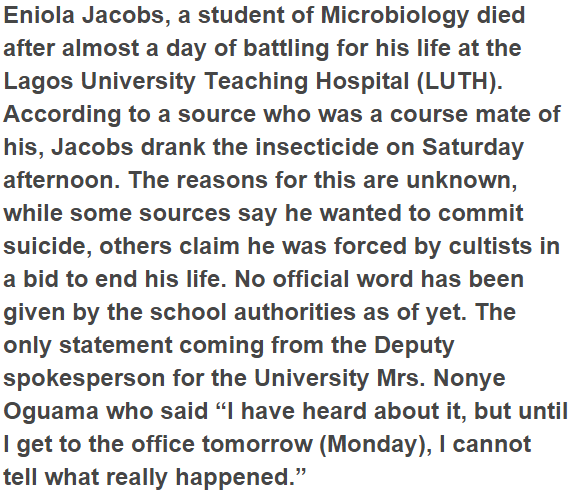 In an awful occurrence, it has been confirmed that a 300 level University of Lagos (Unilag) understudy has passed on subsequent to ingesting the local bug spray ‘Sniper.