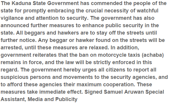 Taking after the bomb impact at Sabongari area in Kaduna state today, the state representative, Nasir El Rufai has banned beggars and road sellers in the state. The order is contained in an statement released by his media associate Samuel Aruwan. See that bellow.