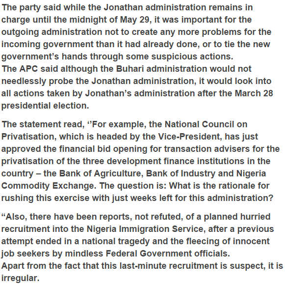 The All Progressives Congress has debilitated to probe the active administration  of President Goodluck Jonathan over some “spur of the moment questionable exercises” in front of the May 29 handover.