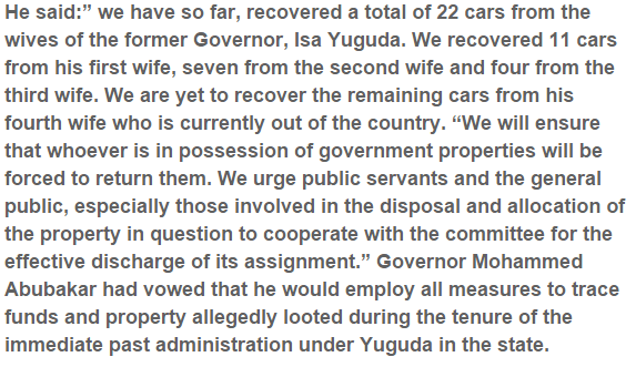 As a major aspect of endeavors to recover every one of its properties, the Bauchi State government has grabbed an aggregate 22 vehicles in the ownership of the wives of previous legislative leader of Bauchi State, Isa Yuguda.