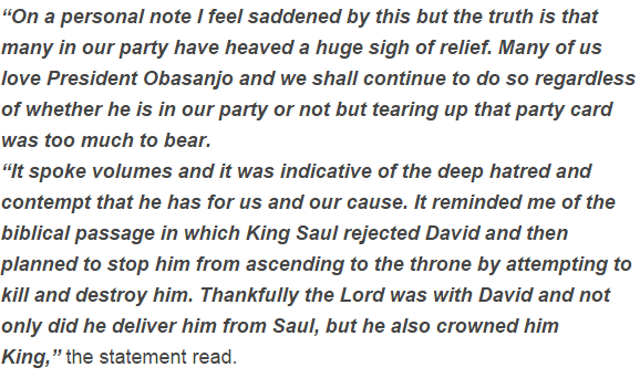 The Director, Media and Publicity, Femi Fani-Kayode, in an announcement, said that Obasanjo has cut off all the ties with his activity. He included that while the previous president was allowed to leave, “he didn’t need to spit in their countenances by freely tearing the gathering card.