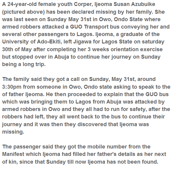 Home / News From Nigeria / Local News / Check out Photos of Female Corps Member missing