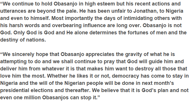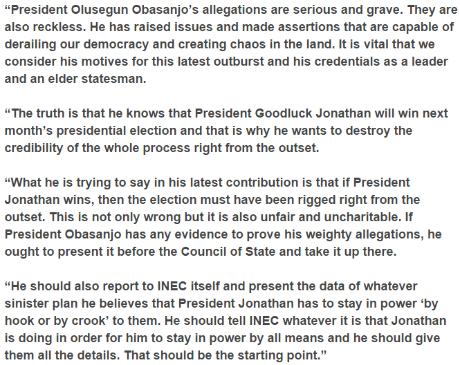 Reacting to Obasanjo’s late assault, Jonathan said the previous president was so determined to controlling his proteges that he would rather see a villain principle than have somebody he would not have the capacity to control. “Control and domination is an obsession for Obasanjo.”