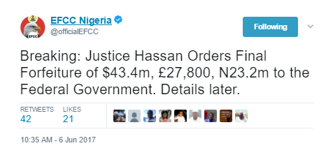 EFCC tweeted and confirmed that a court has ordered the final forfeiture of the unclaimed “$43.4m, £27,800, N23.2m” found in a four bedroom apartment at Osborne Towers, Ikoyi, Lagos in April 2017, to the Federal Government of Nigeria.