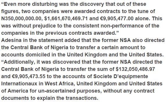 The announcement read thus: “As part of the discoveries, the advisory group has dissected mediations from a few associations that gave funds to the Office of the National Security Adviser, Defense Headquarters, Army Headquarters, Naval Headquarters, and Nigerian Air Force Headquarters, both in local and foreign standards.