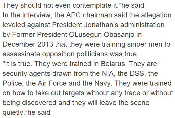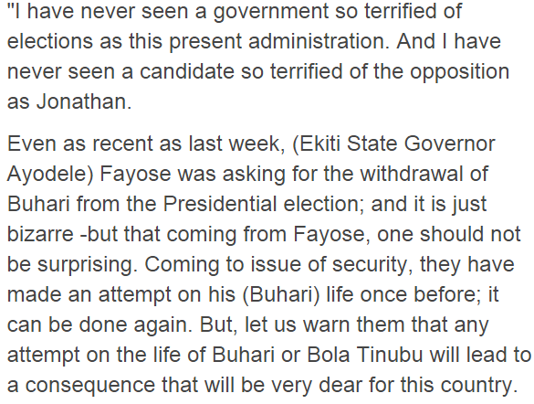 The National Publicity Secretary of the APC, Mr Lai Mohammed has sounded a cautioning to the PDP not to endeavor to assasinate Gen Buhari or one of its Chieftains, Chief Bola Tinubu as it had purportedly done before.