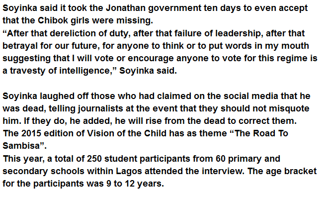 Nobel laureate, Prof. Wole Soyinka, announced on Thursday that nobody ought to vote in favor of the continuation of President Goodluck Jonathan’s legislature, saying that there has been an aggregate disappointment in initiative.