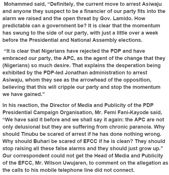 The All Progressives Congress (APC) on Saturday raised the alert that the Federal Government and the Peoples Democratic Party (PDP) have sent a red ready to the Economic and Financial Crimes Commission (EFCC) to capture one of its national pioneers, Bola Tinubu.
