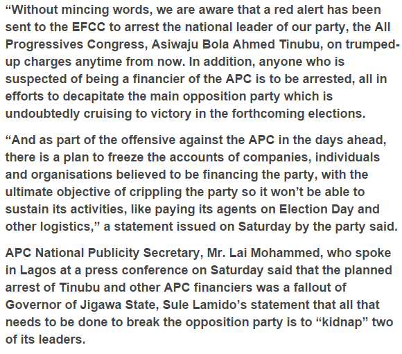 The All Progressives Congress (APC) on Saturday raised the alert that the Federal Government and the Peoples Democratic Party (PDP) have sent a red ready to the Economic and Financial Crimes Commission (EFCC) to capture one of its national pioneers, Bola Tinubu.