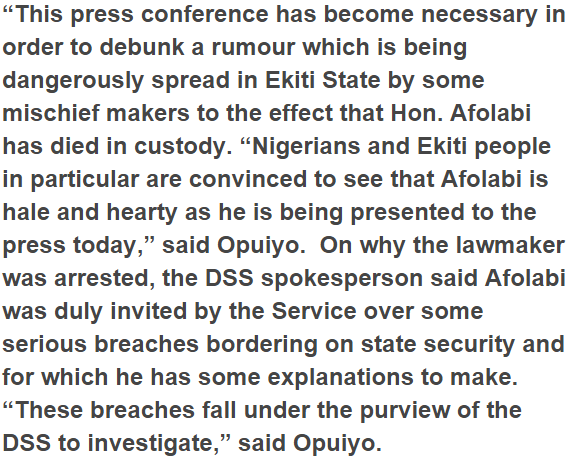 The Department of State Security Services on Thursday dismissed claims that Honorable Akanni Afolabi, a member from Ekiti State House Assembly who has been in its care since a week ago has passed on. The Service said this in response to claims by the Ekiti State Government that the official who has been since he was captured a week ago is dead. Tony Opuyo, representative for DSS rejected the statement in an announcement read out to writers in Abuja that the lawmaker is not dead.