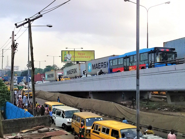 The truck fell on 3 commercial buses and a private car under the bridge. See photos from the accident bellow.