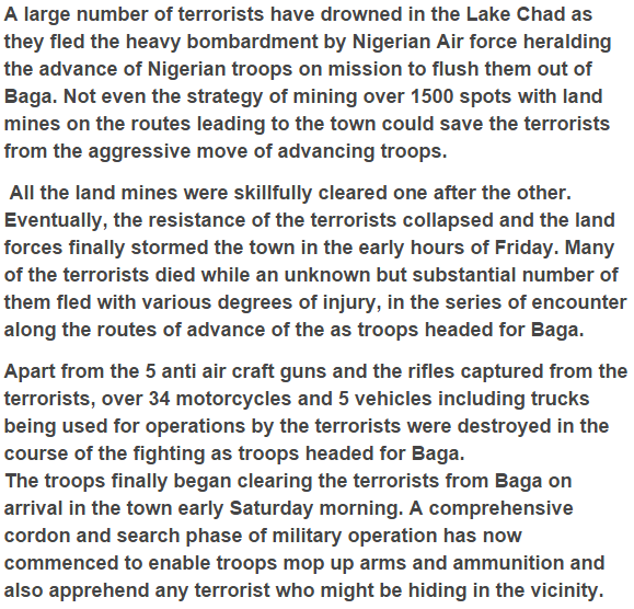 Escaping individuals from Boko Haram faction drowned in Lake Chad after Nigerian troops overwhelmed them amid a counter operations in the North east. Representative of the Defense Headquarters, Gen Chris Olukolade said this in an announcement released today.
