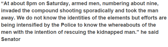 As per reports, nine shooters stormed the home of Pa Defwang Dariye at Mushere, Bokkos Local Government Area of Plateau State on Saturday night February seventh, shot sporadically buzzing around before getting access into his habitation and after that whisking him away on a cruiser. Affirming the occurrence, the state police representative, DSP Abuh Emmanuel, said endeavors are being made to discover the kidnapped man.