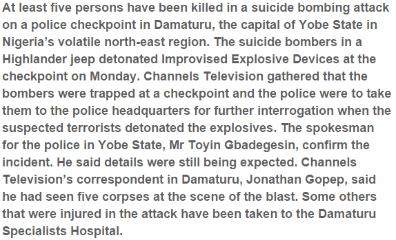 Report just coming to our news desk area reveals that a new bomb assault has happened in Damaturu, Yobe State. This is happening barely three days after suicide bomber assaulted a Muslim praying ground amid the Eid-el-Fritri festivity last Friday.