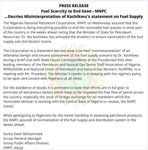 Nigeria National Petroleum Corporation (NNPC) has said that the fuel scarcity and lines in fuel stations will soon come to an end. The Corporation said this in an announcement on Wednesday.