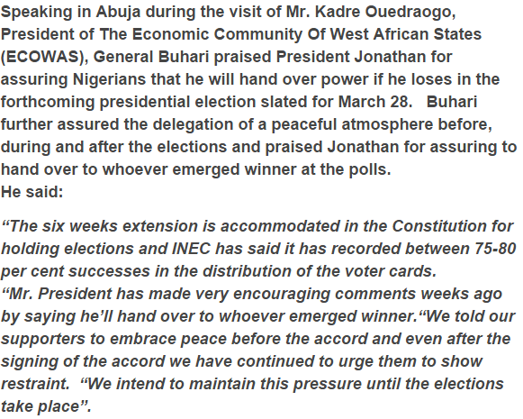 As Nigerians wait to go to the polls for the 2015 elections come March 28 and April 11 respectively, the Presidential candidate of The All Progressives Congress (APC), General Muhammadu Buhari has commended his rival and the incumbent president, Goodluck Jonathan for the first time in a long while.