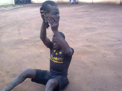 This happened at the beginning of today at Itakpa – Ito town close to Otukpo town, Benue State. A man was found with the head of an elderly man he’d executed at his ranch… he was capture by young people in the town who took him to the police station. The photo was taken inside the police headquarters. Why he guillotined the man has not been confirmed. See the realistic pic after the cut.
