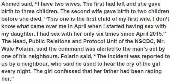 Ahmed, who was paraded by authorities of the Osun State Command of Nigeria Security and Civil Defense Corps said he began engaging in sexual relations with his 14-year-old little girl ( name withheld) in April, 2015.