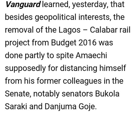 …Vanguard learned, yesterday, that besides geopolitical interests, the removal of the Lagos – Calabar rail project from Budget 2016 was done partly to spite Amaechi supposedly for distancing himself from his former colleagues in the Senate, notably senators Bukola Saraki and Danjuma Goje. “Amaechi was told by associates in the Senate that Goje was not happy with him and that he had teamed up with the Buhari people against his former colleagues in the Governors’ Forum,” a Presidency official conversant with the issue said.