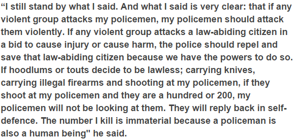 The Assistant Inspector-General of Police accountable for Zone 2, Lagos, Joseph Mbu in a meeting with newsmen in Ogun state last Friday said he remains by his prior articulation that the police will kill 20 for every police life lost amid the decision, demanding his men will kill in self protection.