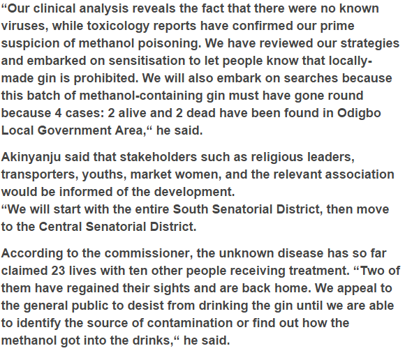 The Ondo Government has banned the generation and utilization of provincially made gin, generally called `ogogoro` in the state. The state Commissioner for Health, Dr Dayo Akinyanju, reported this at a news gathering in Akure on Saturday. The chief credited the boycott to the flare-up of an obscure sickness two weeks prior in Irele Local Government Area of the state.