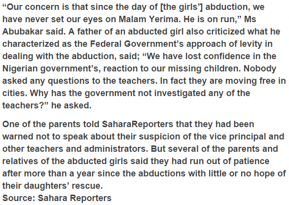 Parents of the missing Chibok girls are currently blaming the vice principal (academic) of the school in Borno where the adolescent young ladies were abducted in 2014 of being to a degree included in their capture.