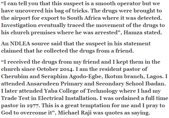 Authorities of the National Drug Law Enforcement Agency (NDLEA) have captured the occupant pastor of the Eternal Sacred Order of Cherubim and Seraphim at Agodo-Egbe, Ikotun Lagos over affirmed unlawful exportation of 174 kilograms of opiate medications to South Africa
