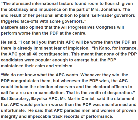Makbere, who is additionally an attorney, expressed this in a meeting in Yenagoa on Friday. He said the divisions in the PDP fold and the overbearing attitude of the President’s wife, Dame Patience, additionally added to the president’s misfortune.