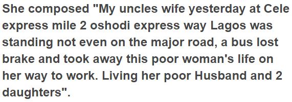 As indicated by facebook user, Promise Nwagu who shared this story, a mother of two was knocked down by a transport that endured brake disappointment at Cele Bustop along the Oshodi-Apapa interstate in Lagos a week ago.