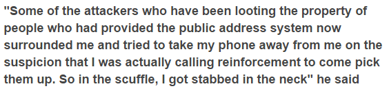 Describing what happened in a meeting with Channels TV, Eruka said the hooligans wounded him while he was attempting to keep his telephone which they needed to take from him.
