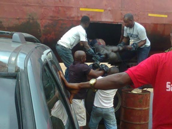 This happened tonight in one of the filling stations along Asaba-Onitsha express route in Asaba. A tanker conductor went to take diesel from a parked tanker at the filling station the previous evening. He ran inside the tanker with his rubber cans however sadly did not succeed and he passed on inside. It took a few men of Delta State fire service to cut open a piece of the tanker to bring his dead body out. I have exclusive photographs and they are graphic so be cautioned. See more pics bellow.