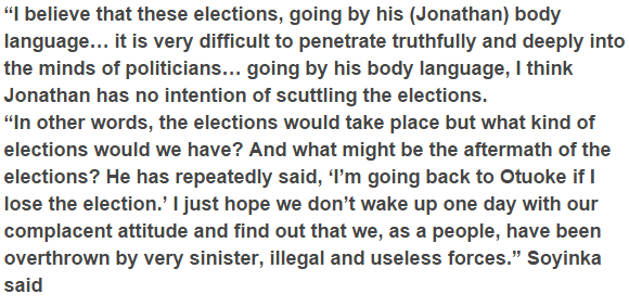 In a meeting with Sahara TV, Nobel laureate, Prof. Wole Soyinka, said ‘unlawful, evil and force grabbers’ are bent on abandoning the nation’s present equitable methodology, are disturbing for an interim government and that president Jonathan knows these individuals.