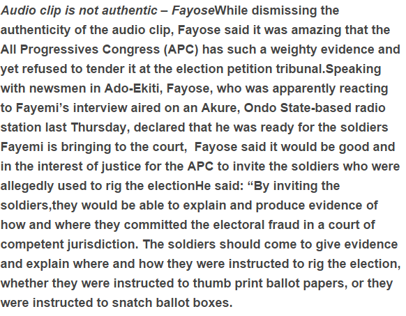 Falana talked on a day Governor Ayo Fayose of Ekiti State asked his prompt forerunner, Dr Kayode Fayemi, to move ahead to court and tender the sound tape where it was claimed that officers were utilized to rig the June 21, 2014 governorship decision in the state. Fayemi had said that soldiers were prepared to affirm.