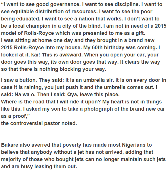 While giving reasons why he dismisses an auto blessing for his 60th birthday, Pastor Bakare said he was not intrigued by turning into a local champion in a city of the blind, saying that, a few persons brought him a 2015 model of Rolls Royce amid his 60th birthday which, he said, he out rightly rejected, including that he was not in need of such extraordinary auto while larger part of Nigerians are suffering from neediness.