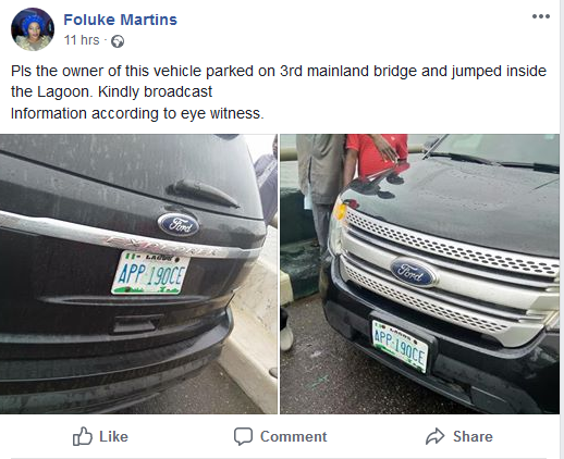 It was reported that the deceased was a lady, who parked her Ford Explorer SUV on the top of 3rd Mainland bridge and plunged into the lagoon. Although some others said she isn’t the owner of the SUV and the owner witnessed the jump while trying to disuade her from jumping.