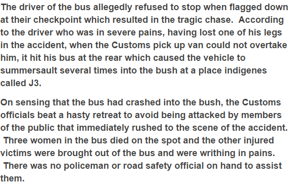 Three matured women somewhere around 25 and 30 years passed on on Thursday evening after the hummer transport in which they were travelling was knocked out of the Lagos-Benin roadway by an operational vehicle by agents of the Nigerian Customs Service.