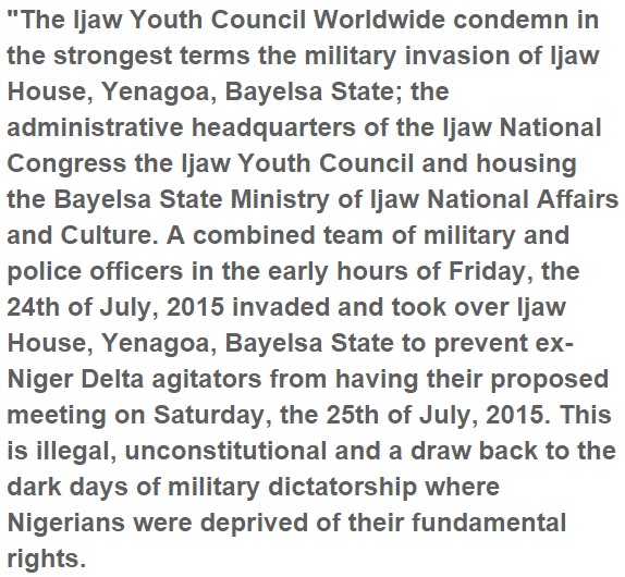 The proposed MEND meeting which was booked to hold at the beginning of today did not hold as officers supposedly closed the Ijaw House, venue of the proposed meeting on the requests of the state senator, Dickson Seriake. Sources at the governors office say Seriake had sent a letter to MEND individuals proposing to meet with them at a later date to discuss their grievances. The gathering, through its representative, Eric Omare, released an announcement denouncing the troops intrusion of Ijaw House. Read the announcement bellow.