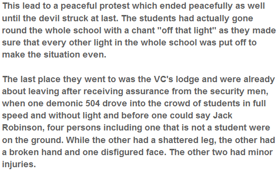 Unable to avoid the fact that such a marvel as this could rehash in the UNN branch, which had even been the most exceedingly bad hit,the school gave an impromptu break to the whole understudies which ought to keep going for two weeks to enable them deal with issues. With respect to this, they declined to put on the hostel generators. Understudies were angry since this was the main hope they have of in any event powering their telephones and since the break was due to begin tomorrow, not today.