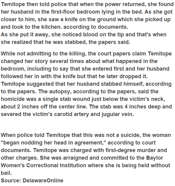 35 year old Nigerian lady, Adebamiro Temitope, imagined left, has been captured by the New Castle Police in Delaware, Philadelphia for wounding her 37 year old Nigerian spouse and father of her two kids, Adeyinka Adebamiro to death over claims of ill-use and swindling.