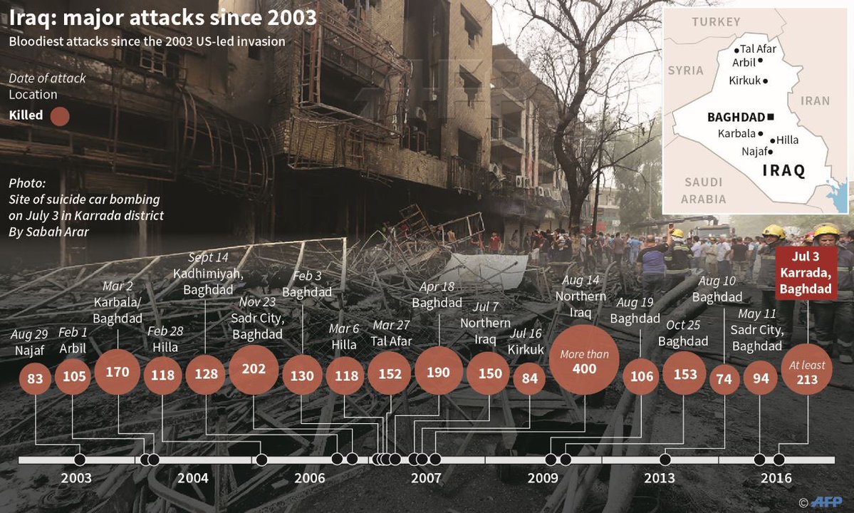 The AFP infographics depicts the biggest terrorist attacks in Iraq since the US invasion in the country in 2003.
