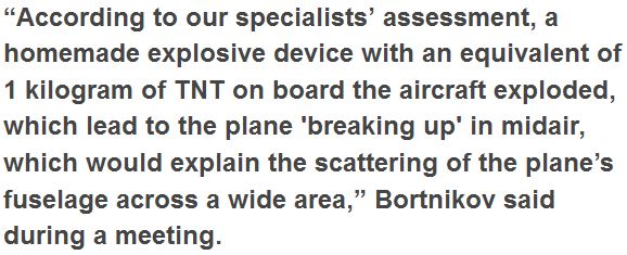 A blast of the homemade made bomb of up to 1kg of TNT equivalent was the reason for the A321 crash in Sinai, Russian Security Service (FSB) head Alexander Bortnikov said.