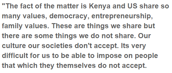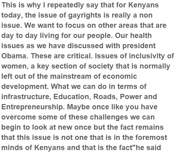 Kenya is a hostile to gay nation. The following is what President Obama said when asked amid a question and answer session this evening in Nairobi what he thinks about gay rights in Kenya.