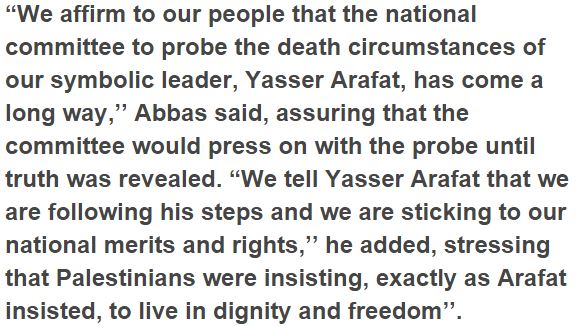 He purportedly made the insistence in a recorded broadcast message in Riyadh, to Palestinians in remembrance of eleventh commemoration of the passing of Arafat. Arafat kicked the bucket of a secretive infection in a French healing center in 2004.