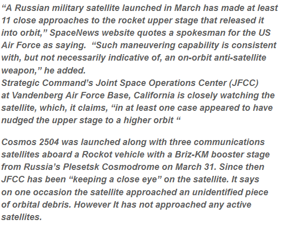 The mobility of Russia’s Cosmos-2504 military satellite dispatched on March 31 from the Plesetsk test site has frightened the US Air Force, which supposes it might possibly be an “on-orbit hostile to satellite weapon.”