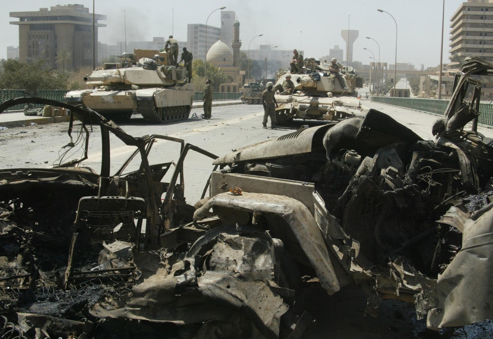 © AFP 2015/ RAMZI HAIDAR US marines sit on their tanks behind the wreckage of destroyed cars on al-Jumhuriya bridge in Baghdad 11 April 2003
