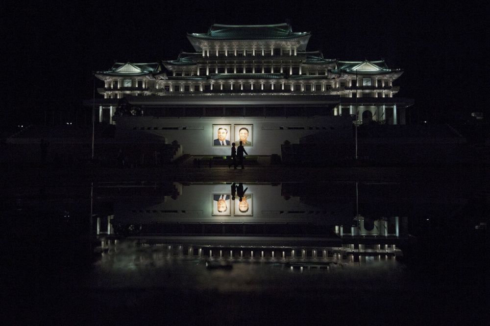 People walk in front of portraits of North Korea’s founder Kim Il-sung (L) and former leader Kim Jong-il at Pyongyang’s main square.