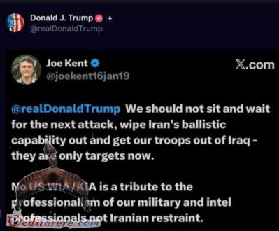 Trump just posted a screenshot of a January 2020 post from Joe Kent calling for the destruction of Iran’s ballistic missile capability and the withdrawal of US troops from Iraq.