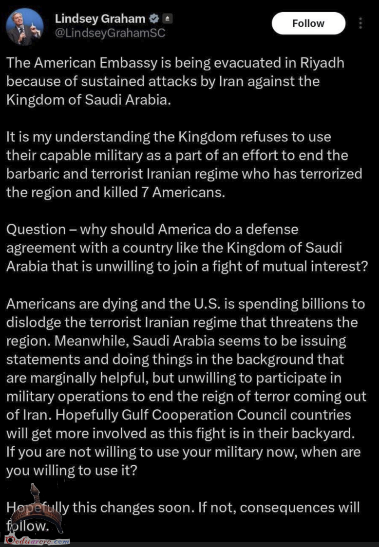 🇺🇸🇸🇦 Lindsey “Gay For War” Graham is upset that the Saudis don’t want war with Iran.