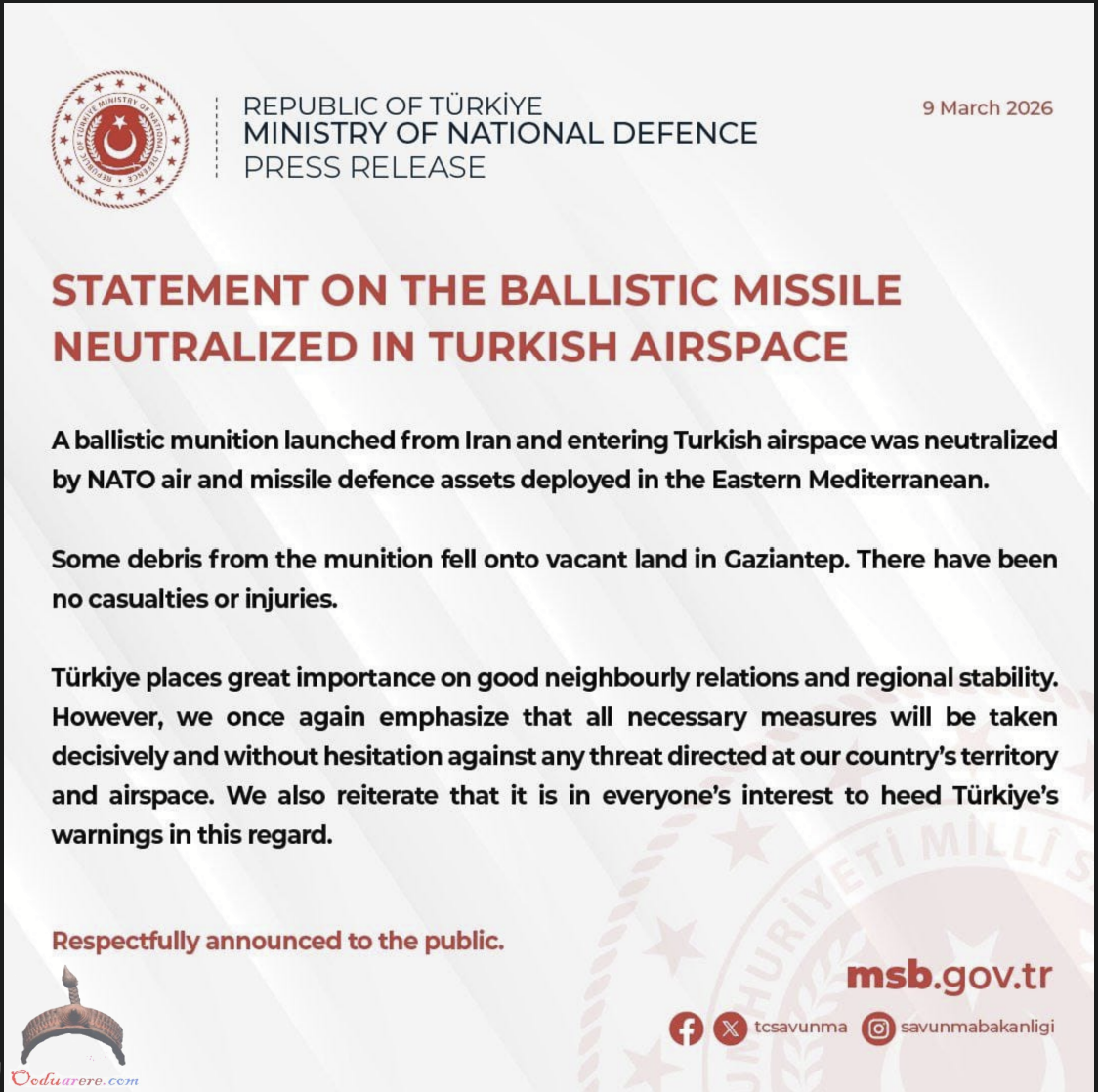 🇹🇷 Turkey reports that an Iranian ballistic missile was intercepted over the eastern Mediterranean by NATO air defenses, likely an SM-3 launched from a U.S. destroyer.